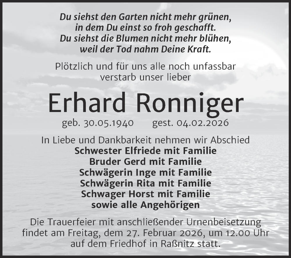 Hier finden Sie alle Traueranzeigen aus der Zeitung, die bisher für Erhard Ronniger erschienen sind. Weitere Traueranzeigen, die in der Zeitung erscheinen, werden hier ebenfalls aufgelistet