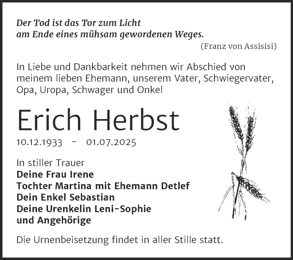 Hier finden Sie alle Traueranzeigen aus der Zeitung, die bisher für Erich Herbst erschienen sind. Weitere Traueranzeigen, die in der Zeitung erscheinen, werden hier ebenfalls aufgelistet