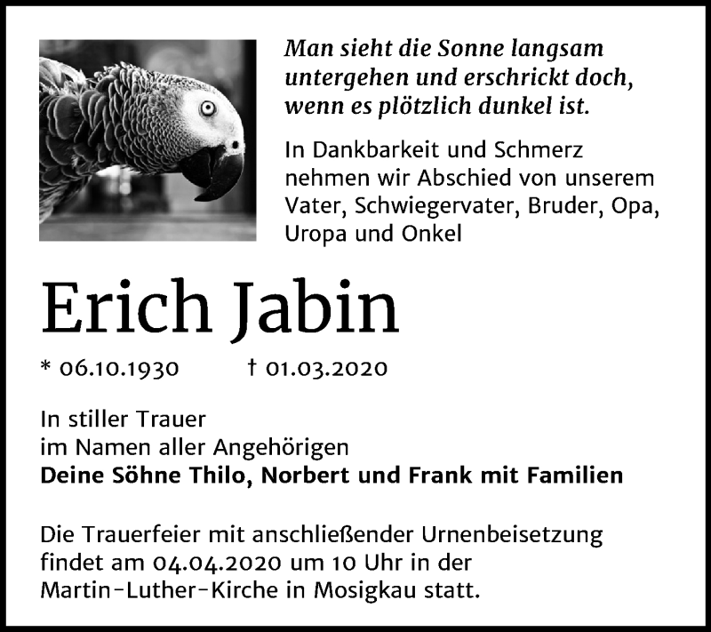 Hier finden Sie alle Traueranzeigen aus der Zeitung, die bisher für Erich Jabin erschienen sind. Weitere Traueranzeigen, die in der Zeitung erscheinen, werden hier ebenfalls aufgelistet