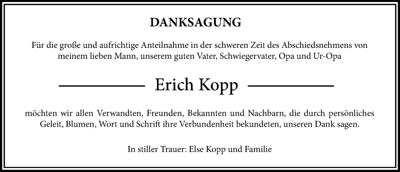 Hier finden Sie alle Traueranzeigen aus der Zeitung, die bisher für Erich Kopp erschienen sind. Weitere Traueranzeigen, die in der Zeitung erscheinen, werden hier ebenfalls aufgelistet