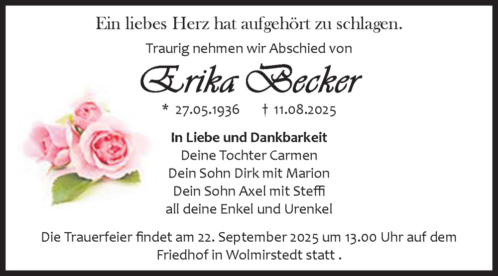 Hier finden Sie alle Traueranzeigen aus der Zeitung, die bisher für Erika Becker erschienen sind. Weitere Traueranzeigen, die in der Zeitung erscheinen, werden hier ebenfalls aufgelistet