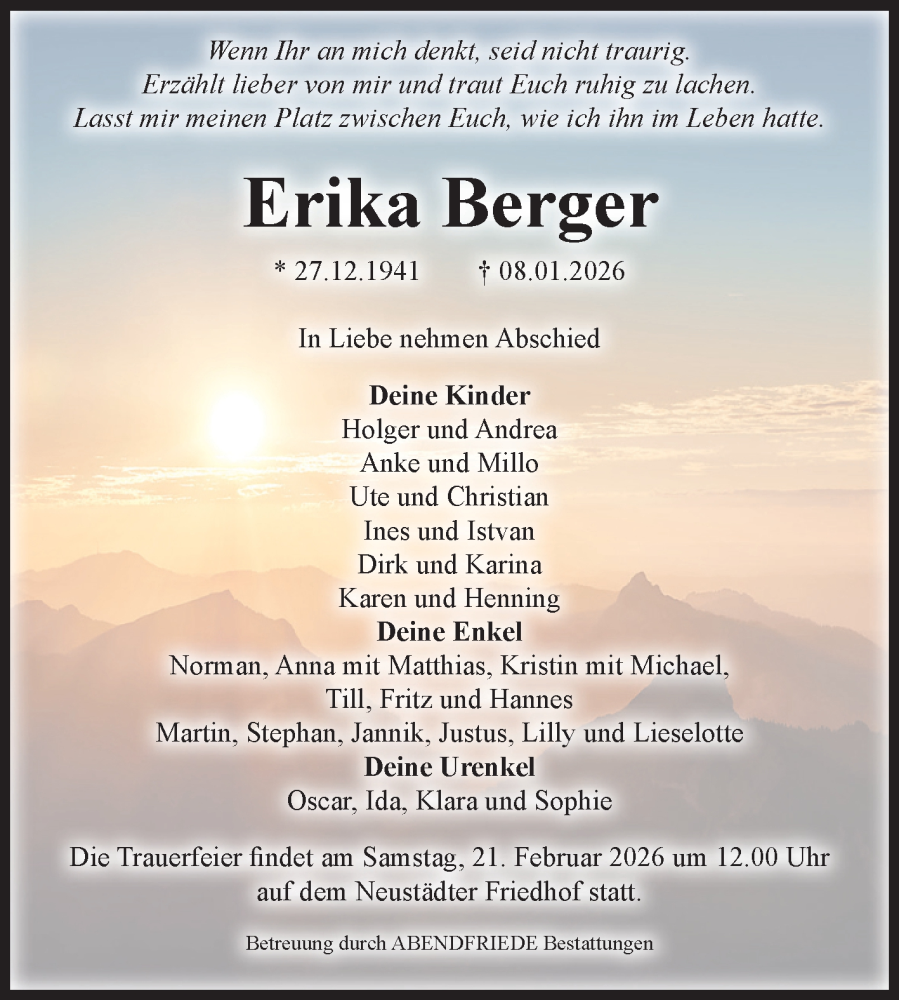 Hier finden Sie alle Traueranzeigen aus der Zeitung, die bisher für Erika Berger erschienen sind. Weitere Traueranzeigen, die in der Zeitung erscheinen, werden hier ebenfalls aufgelistet