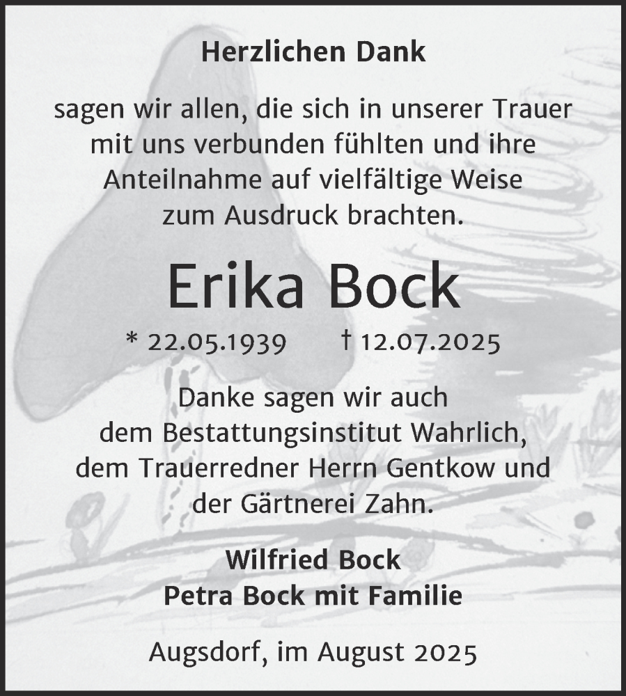 Hier finden Sie alle Traueranzeigen aus der Zeitung, die bisher für Erika Bock erschienen sind. Weitere Traueranzeigen, die in der Zeitung erscheinen, werden hier ebenfalls aufgelistet