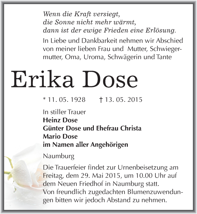 Hier finden Sie alle Traueranzeigen aus der Zeitung, die bisher für Erika Dose erschienen sind. Weitere Traueranzeigen, die in der Zeitung erscheinen, werden hier ebenfalls aufgelistet