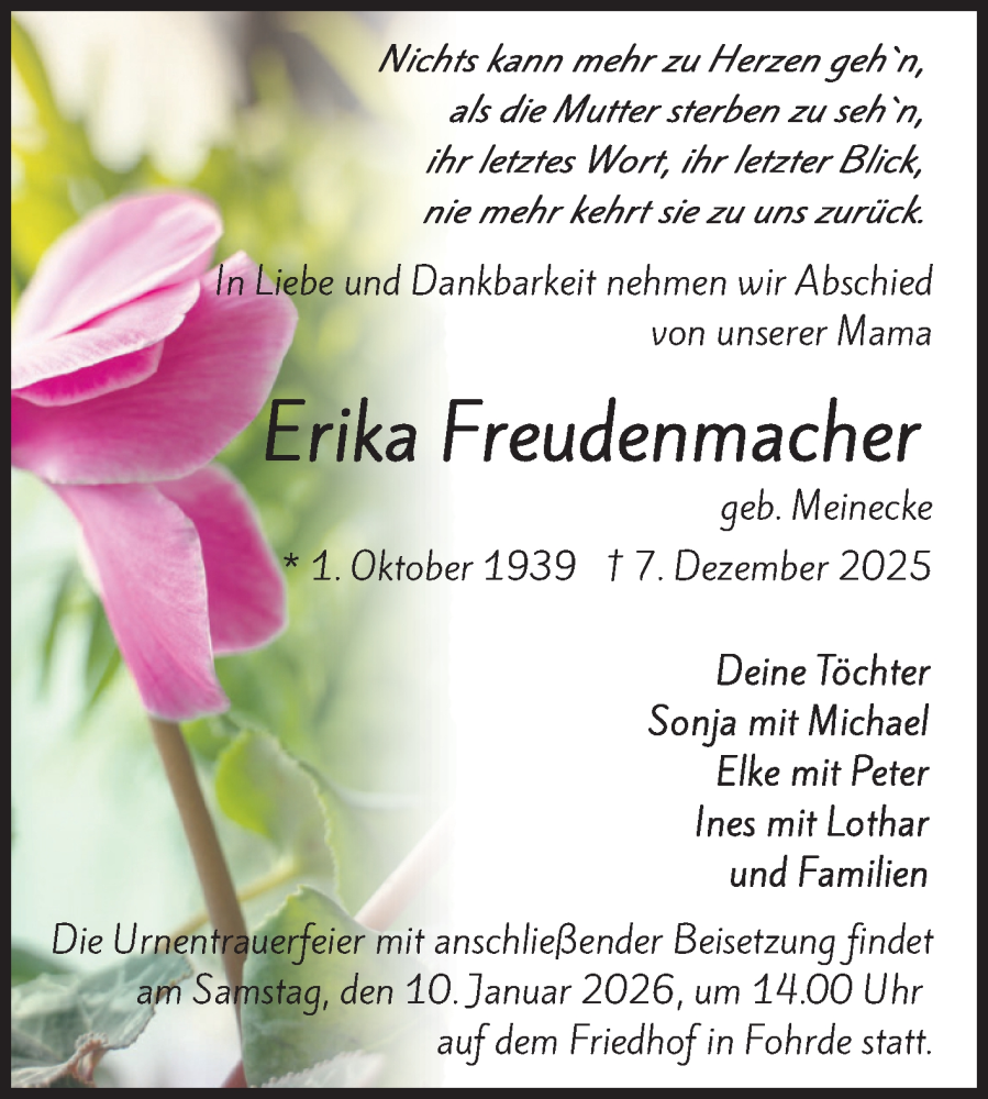 Hier finden Sie alle Traueranzeigen aus der Zeitung, die bisher für Erika Freudenmacher erschienen sind. Weitere Traueranzeigen, die in der Zeitung erscheinen, werden hier ebenfalls aufgelistet