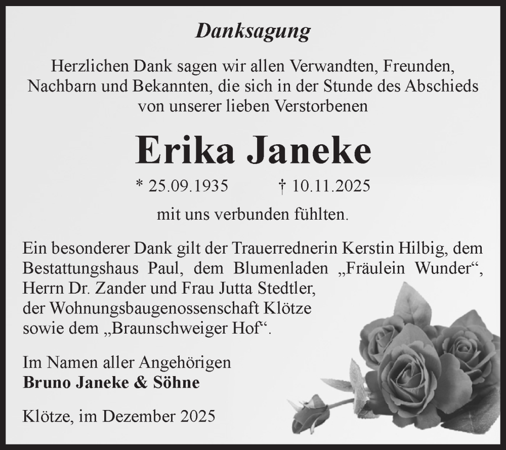 Hier finden Sie alle Traueranzeigen aus der Zeitung, die bisher für Erika Janeke erschienen sind. Weitere Traueranzeigen, die in der Zeitung erscheinen, werden hier ebenfalls aufgelistet