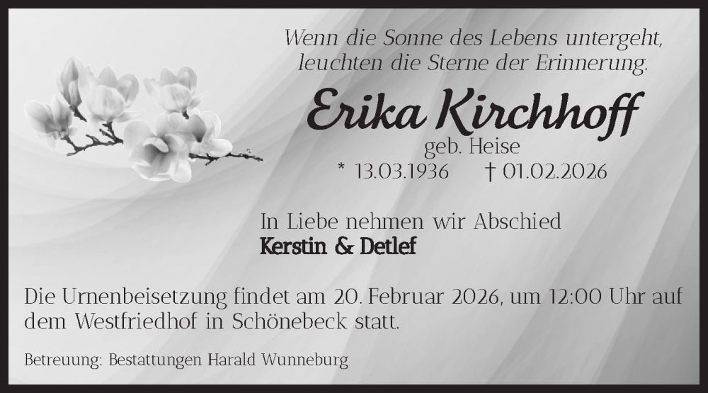 Hier finden Sie alle Traueranzeigen aus der Zeitung, die bisher für Erika Kirchhoff erschienen sind. Weitere Traueranzeigen, die in der Zeitung erscheinen, werden hier ebenfalls aufgelistet
