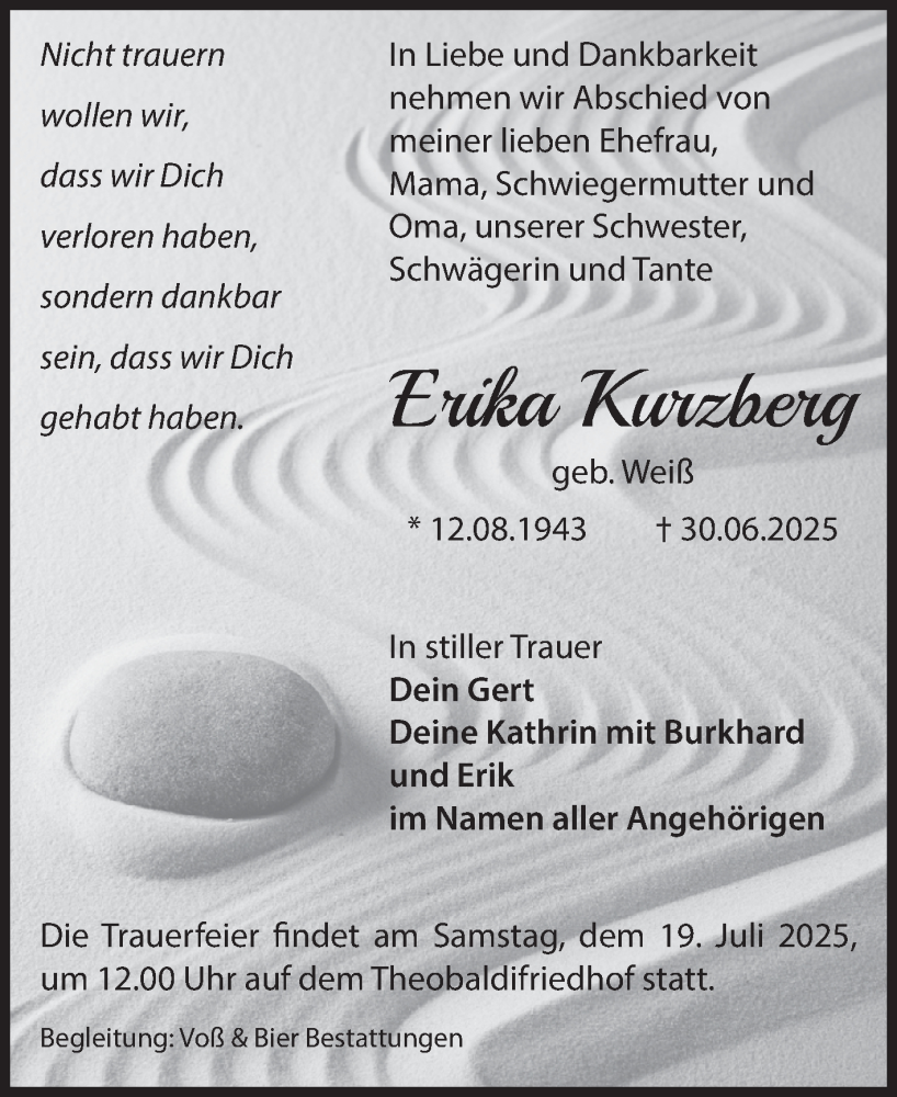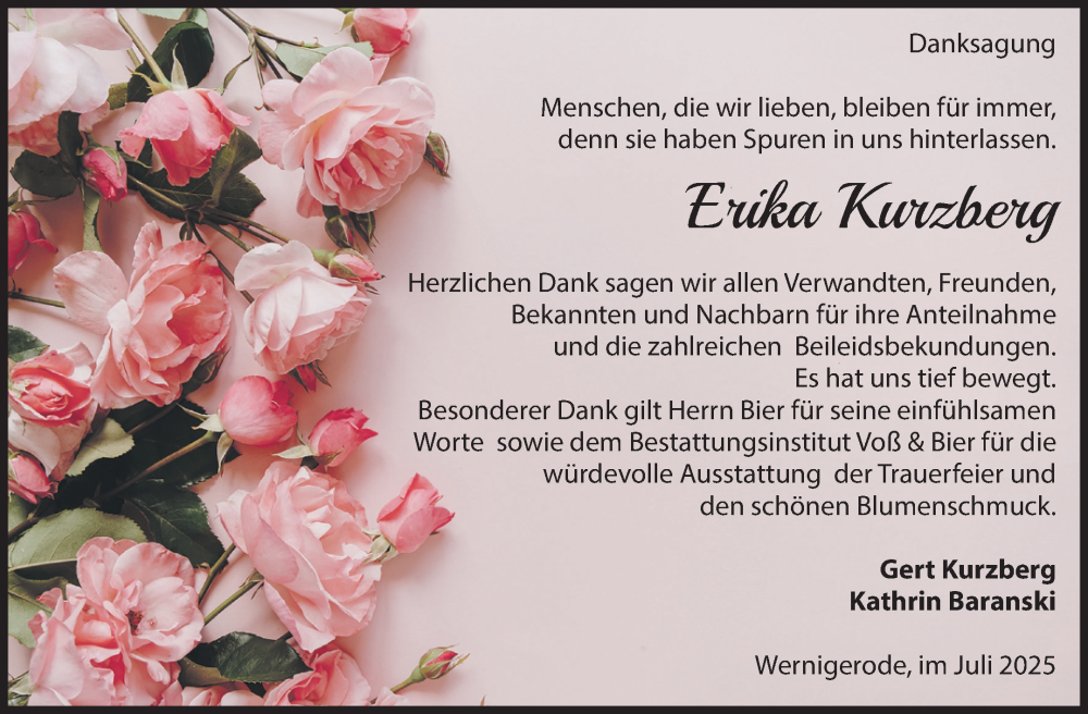 Hier finden Sie alle Traueranzeigen aus der Zeitung, die bisher für Erika Kurzberg erschienen sind. Weitere Traueranzeigen, die in der Zeitung erscheinen, werden hier ebenfalls aufgelistet