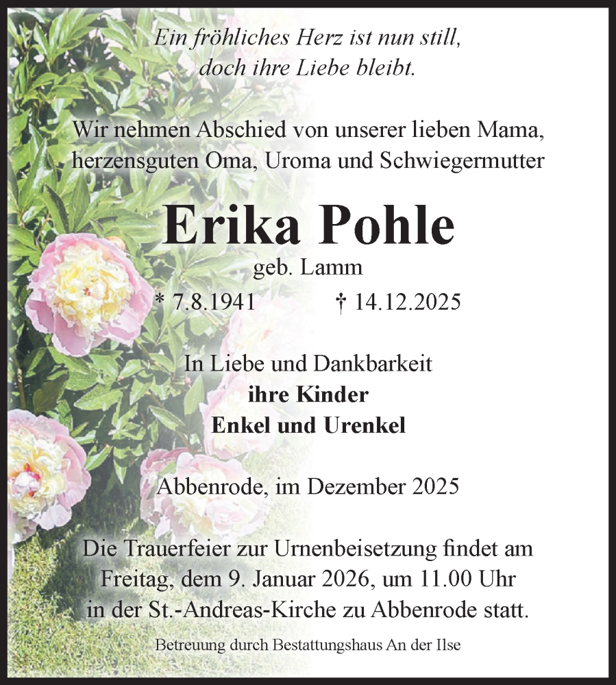 Hier finden Sie alle Traueranzeigen aus der Zeitung, die bisher für Erika Pohle erschienen sind. Weitere Traueranzeigen, die in der Zeitung erscheinen, werden hier ebenfalls aufgelistet