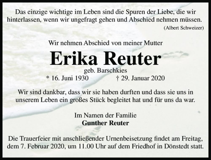Hier finden Sie alle Traueranzeigen aus der Zeitung, die bisher für Erika Reuter (geb. Barschkies) erschienen sind. Weitere Traueranzeigen, die in der Zeitung erscheinen, werden hier ebenfalls aufgelistet