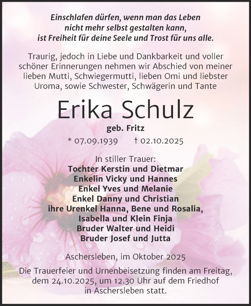 Hier finden Sie alle Traueranzeigen aus der Zeitung, die bisher für Erika Schulz erschienen sind. Weitere Traueranzeigen, die in der Zeitung erscheinen, werden hier ebenfalls aufgelistet