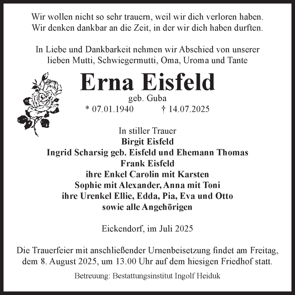 Hier finden Sie alle Traueranzeigen aus der Zeitung, die bisher für Erna Eisfeld erschienen sind. Weitere Traueranzeigen, die in der Zeitung erscheinen, werden hier ebenfalls aufgelistet