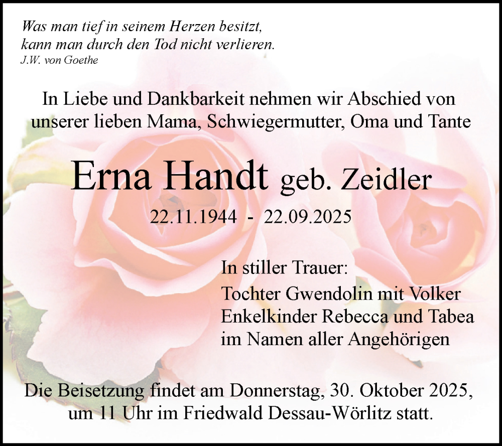 Hier finden Sie alle Traueranzeigen aus der Zeitung, die bisher für Erna Handt erschienen sind. Weitere Traueranzeigen, die in der Zeitung erscheinen, werden hier ebenfalls aufgelistet