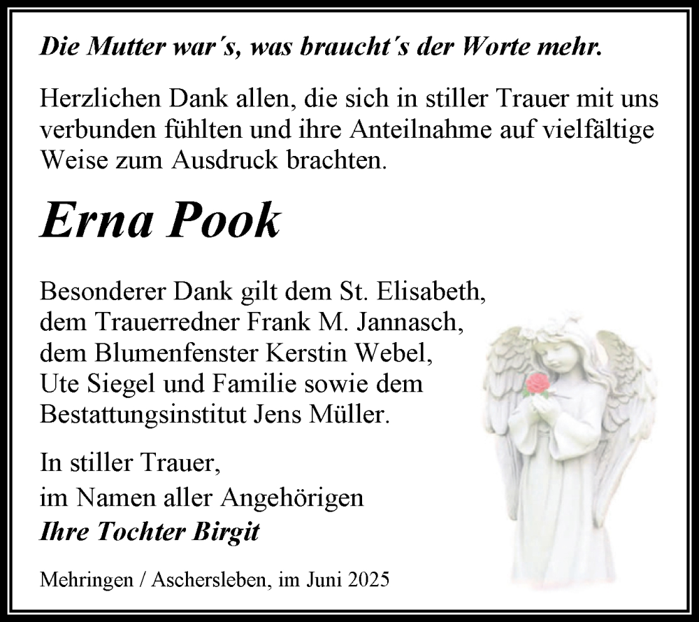 Hier finden Sie alle Traueranzeigen aus der Zeitung, die bisher für Erna Pook erschienen sind. Weitere Traueranzeigen, die in der Zeitung erscheinen, werden hier ebenfalls aufgelistet