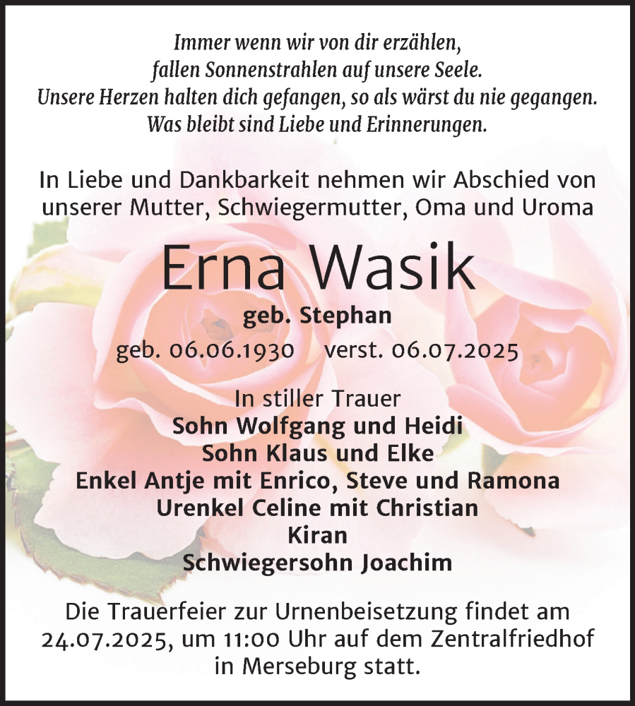 Hier finden Sie alle Traueranzeigen aus der Zeitung, die bisher für Erna Wasik erschienen sind. Weitere Traueranzeigen, die in der Zeitung erscheinen, werden hier ebenfalls aufgelistet
