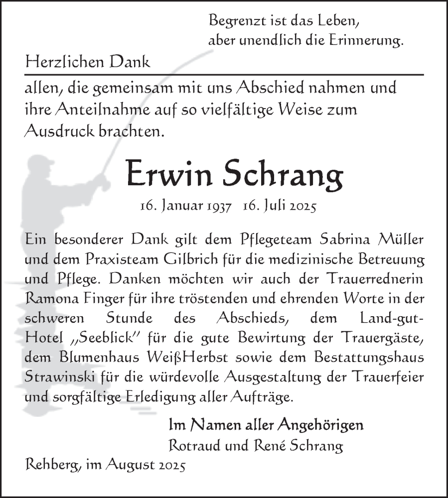 Hier finden Sie alle Traueranzeigen aus der Zeitung, die bisher für Erwin Schrang erschienen sind. Weitere Traueranzeigen, die in der Zeitung erscheinen, werden hier ebenfalls aufgelistet