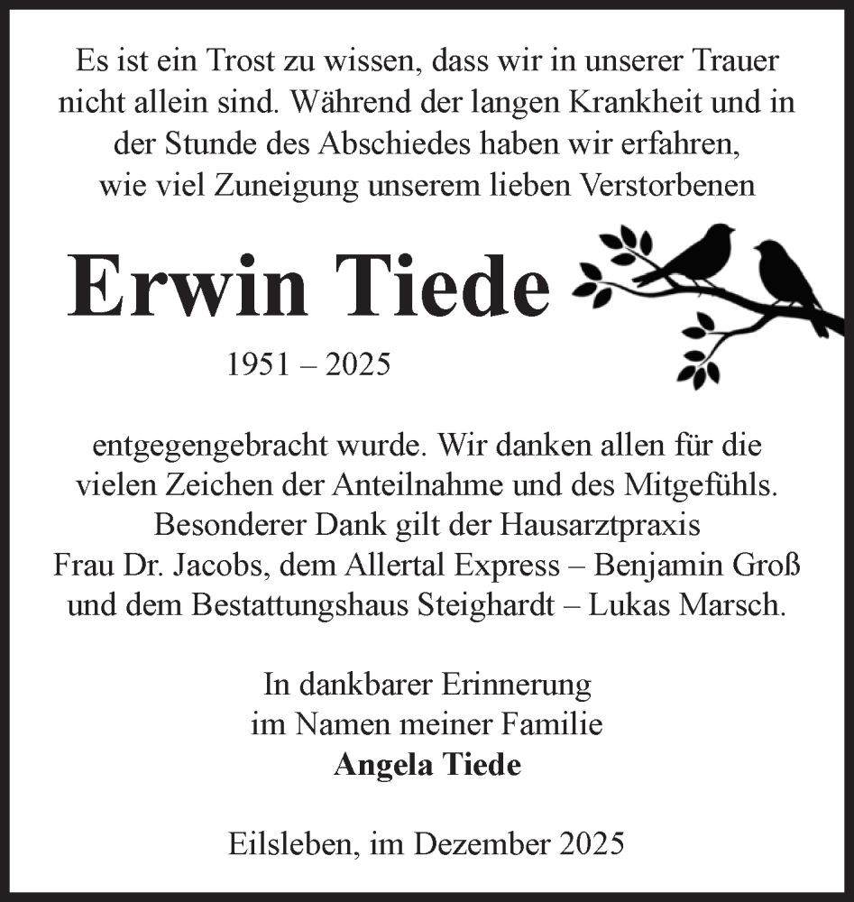 Hier finden Sie alle Traueranzeigen aus der Zeitung, die bisher für Erwin Tiede erschienen sind. Weitere Traueranzeigen, die in der Zeitung erscheinen, werden hier ebenfalls aufgelistet