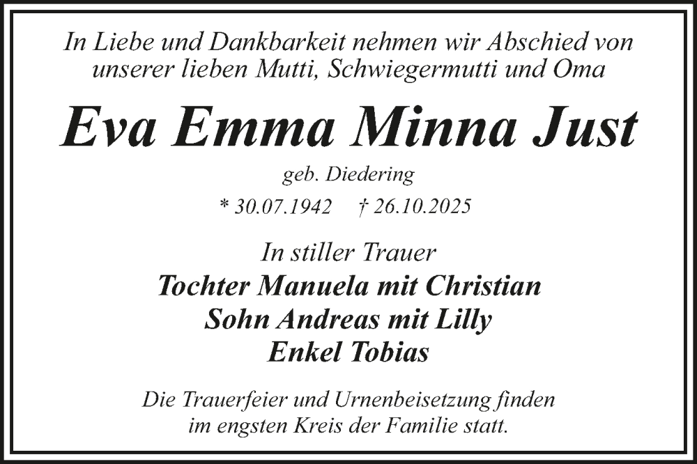 Hier finden Sie alle Traueranzeigen aus der Zeitung, die bisher für Eva Emma Minna Just erschienen sind. Weitere Traueranzeigen, die in der Zeitung erscheinen, werden hier ebenfalls aufgelistet