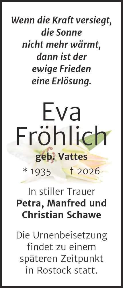 Hier finden Sie alle Traueranzeigen aus der Zeitung, die bisher für Eva Fröhlich erschienen sind. Weitere Traueranzeigen, die in der Zeitung erscheinen, werden hier ebenfalls aufgelistet