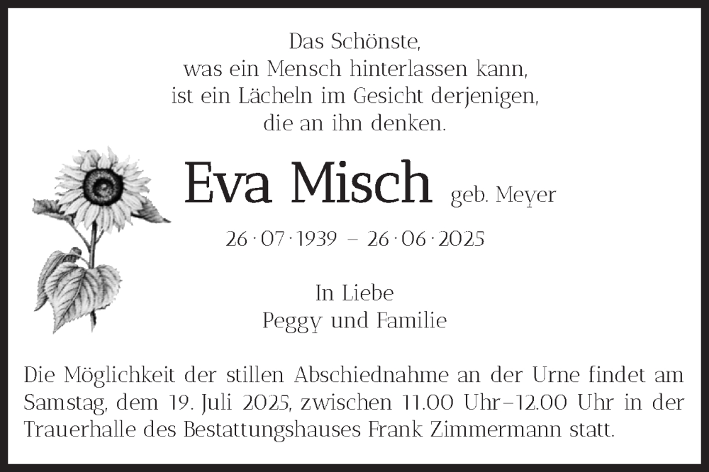 Hier finden Sie alle Traueranzeigen aus der Zeitung, die bisher für Eva Misch erschienen sind. Weitere Traueranzeigen, die in der Zeitung erscheinen, werden hier ebenfalls aufgelistet