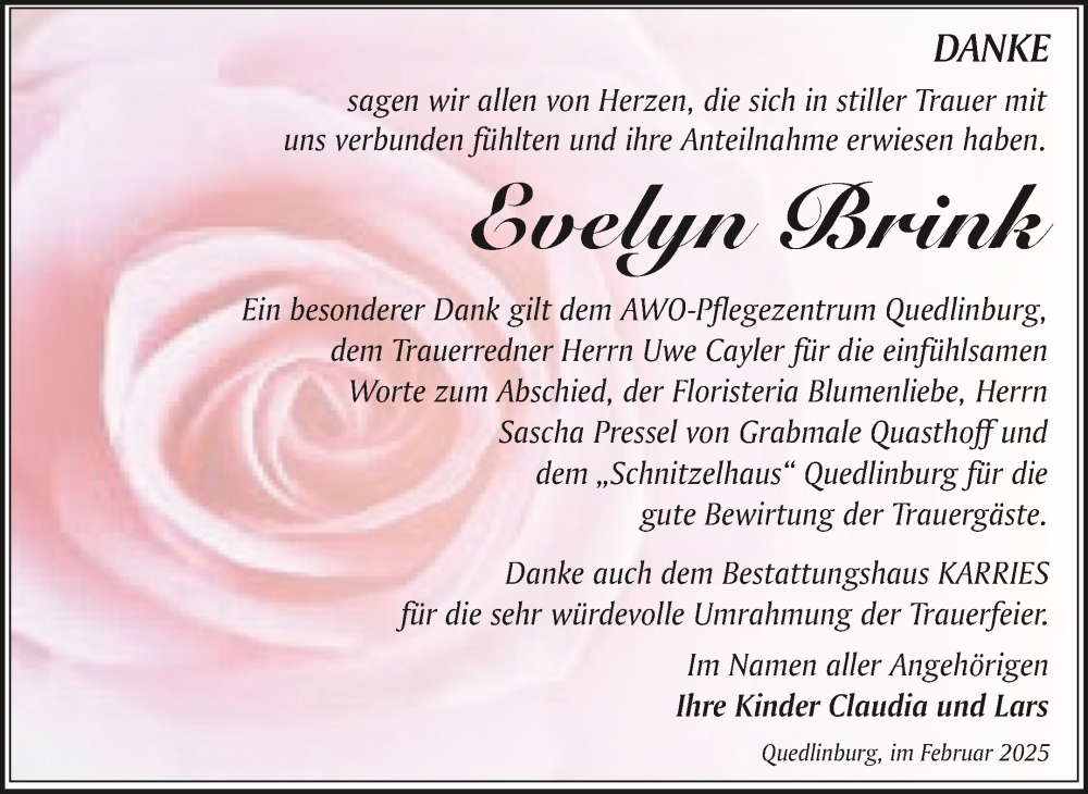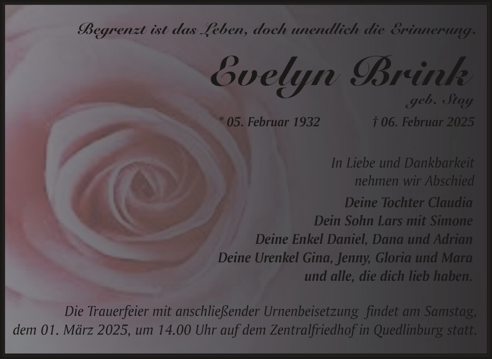 Hier finden Sie alle Traueranzeigen aus der Zeitung, die bisher für Evelyn Brink erschienen sind. Weitere Traueranzeigen, die in der Zeitung erscheinen, werden hier ebenfalls aufgelistet