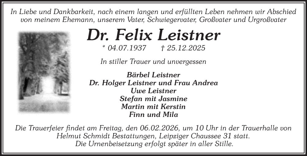 Hier finden Sie alle Traueranzeigen aus der Zeitung, die bisher für Felix Leistner erschienen sind. Weitere Traueranzeigen, die in der Zeitung erscheinen, werden hier ebenfalls aufgelistet