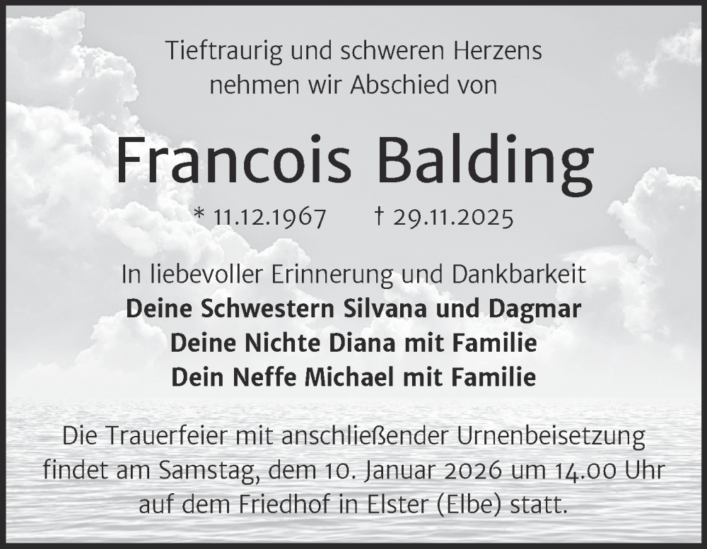 Hier finden Sie alle Traueranzeigen aus der Zeitung, die bisher für Francois Balding erschienen sind. Weitere Traueranzeigen, die in der Zeitung erscheinen, werden hier ebenfalls aufgelistet