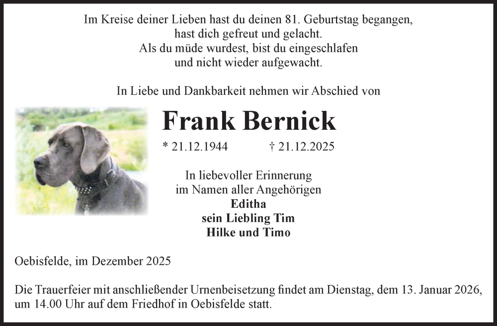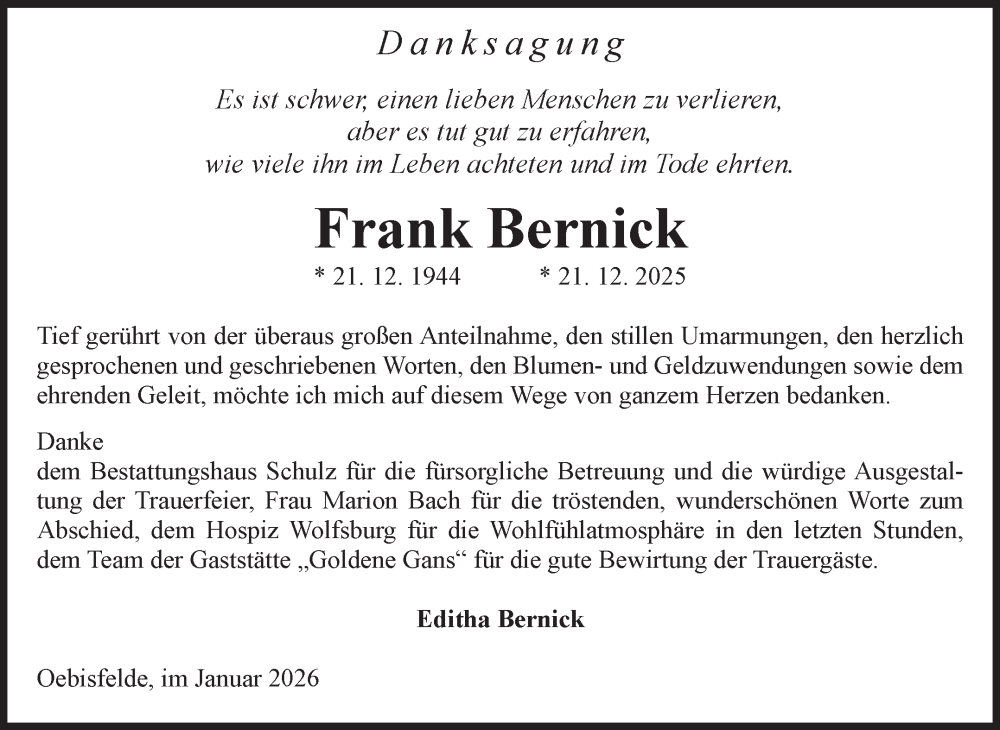 Hier finden Sie alle Traueranzeigen aus der Zeitung, die bisher für Frank Bernick erschienen sind. Weitere Traueranzeigen, die in der Zeitung erscheinen, werden hier ebenfalls aufgelistet