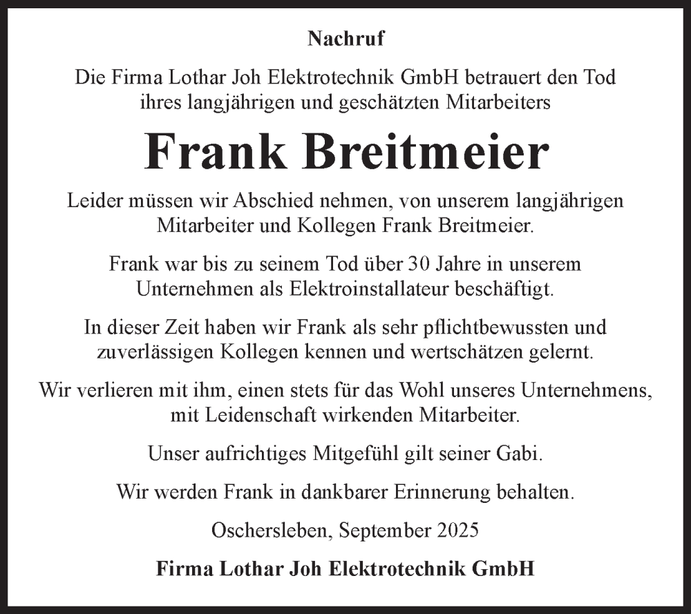 Hier finden Sie alle Traueranzeigen aus der Zeitung, die bisher für Frank Breitmeier erschienen sind. Weitere Traueranzeigen, die in der Zeitung erscheinen, werden hier ebenfalls aufgelistet
