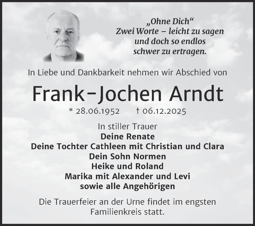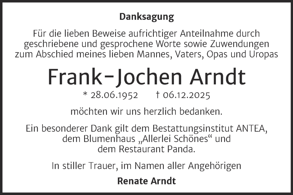 Hier finden Sie alle Traueranzeigen aus der Zeitung, die bisher für Frank-Jochen Arndt erschienen sind. Weitere Traueranzeigen, die in der Zeitung erscheinen, werden hier ebenfalls aufgelistet