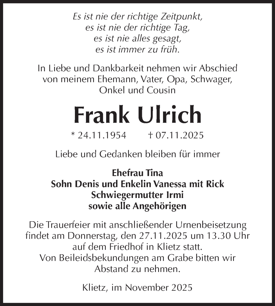 Hier finden Sie alle Traueranzeigen aus der Zeitung, die bisher für Frank Ulrich erschienen sind. Weitere Traueranzeigen, die in der Zeitung erscheinen, werden hier ebenfalls aufgelistet
