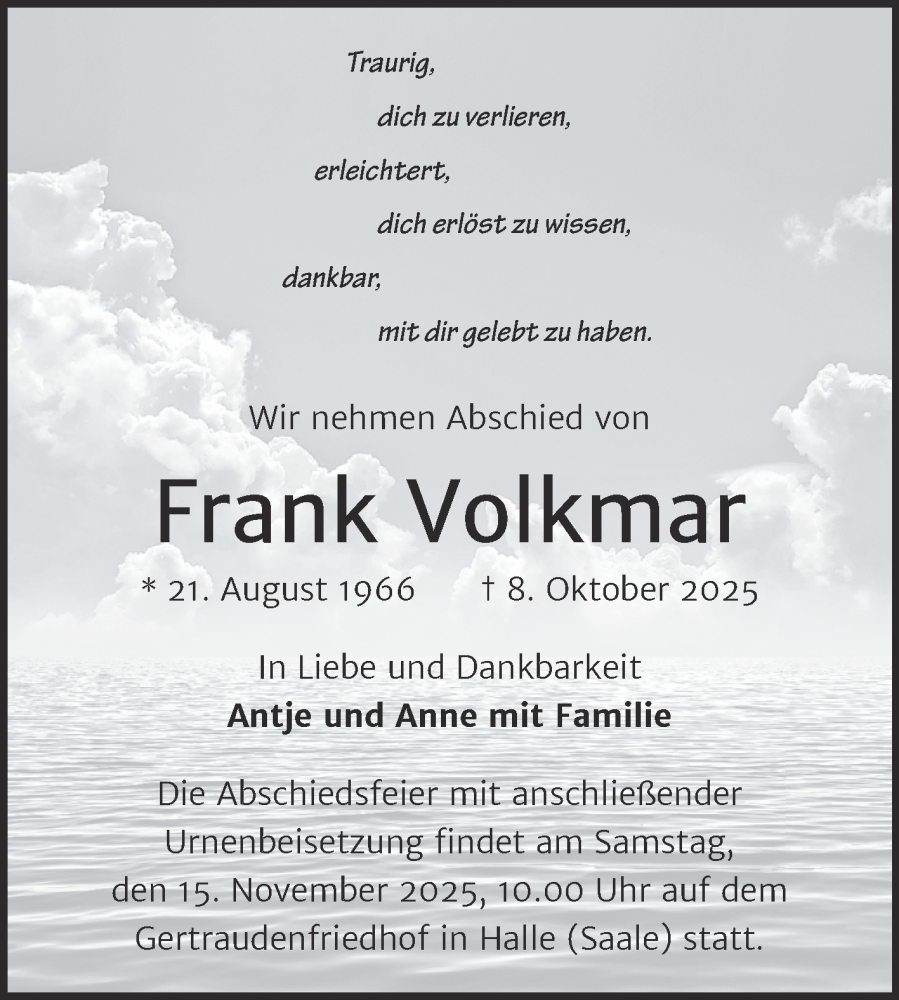 Hier finden Sie alle Traueranzeigen aus der Zeitung, die bisher für Frank Volkmar erschienen sind. Weitere Traueranzeigen, die in der Zeitung erscheinen, werden hier ebenfalls aufgelistet