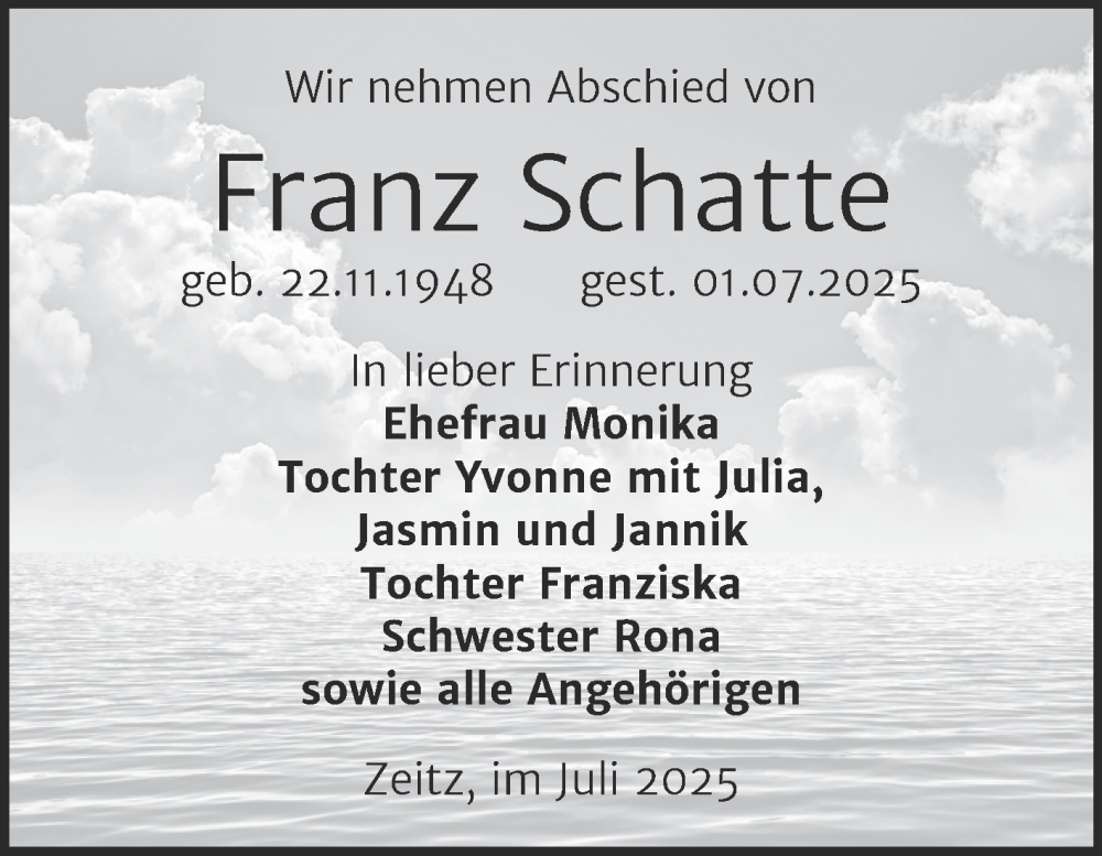 Hier finden Sie alle Traueranzeigen aus der Zeitung, die bisher für Franz Schatte erschienen sind. Weitere Traueranzeigen, die in der Zeitung erscheinen, werden hier ebenfalls aufgelistet