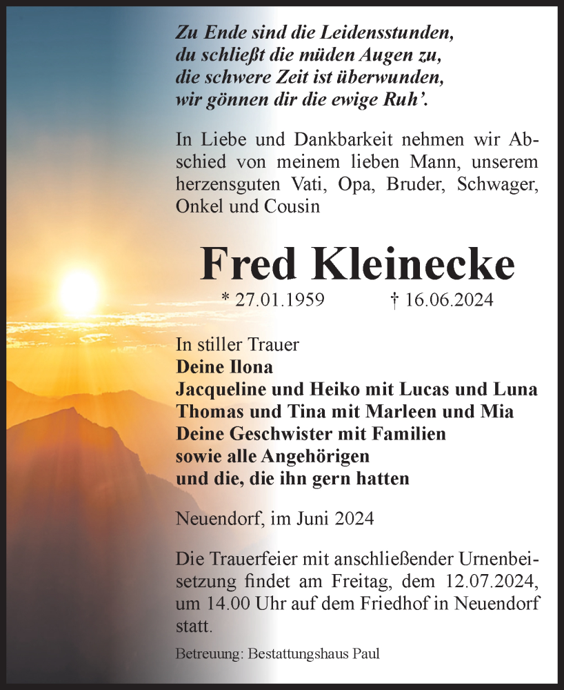 Hier finden Sie alle Traueranzeigen aus der Zeitung, die bisher für Fred Kleinecke erschienen sind. Weitere Traueranzeigen, die in der Zeitung erscheinen, werden hier ebenfalls aufgelistet