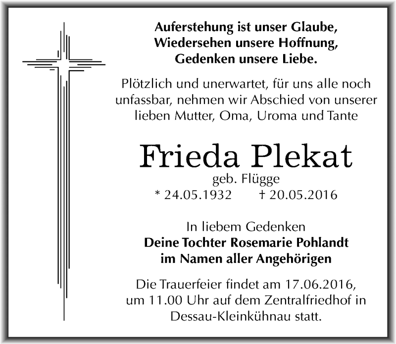 Hier finden Sie alle Traueranzeigen aus der Zeitung, die bisher für Frieda Plekat erschienen sind. Weitere Traueranzeigen, die in der Zeitung erscheinen, werden hier ebenfalls aufgelistet