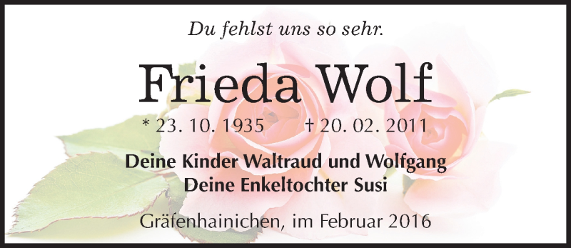 Hier finden Sie alle Traueranzeigen aus der Zeitung, die bisher für Frieda Wolf erschienen sind. Weitere Traueranzeigen, die in der Zeitung erscheinen, werden hier ebenfalls aufgelistet