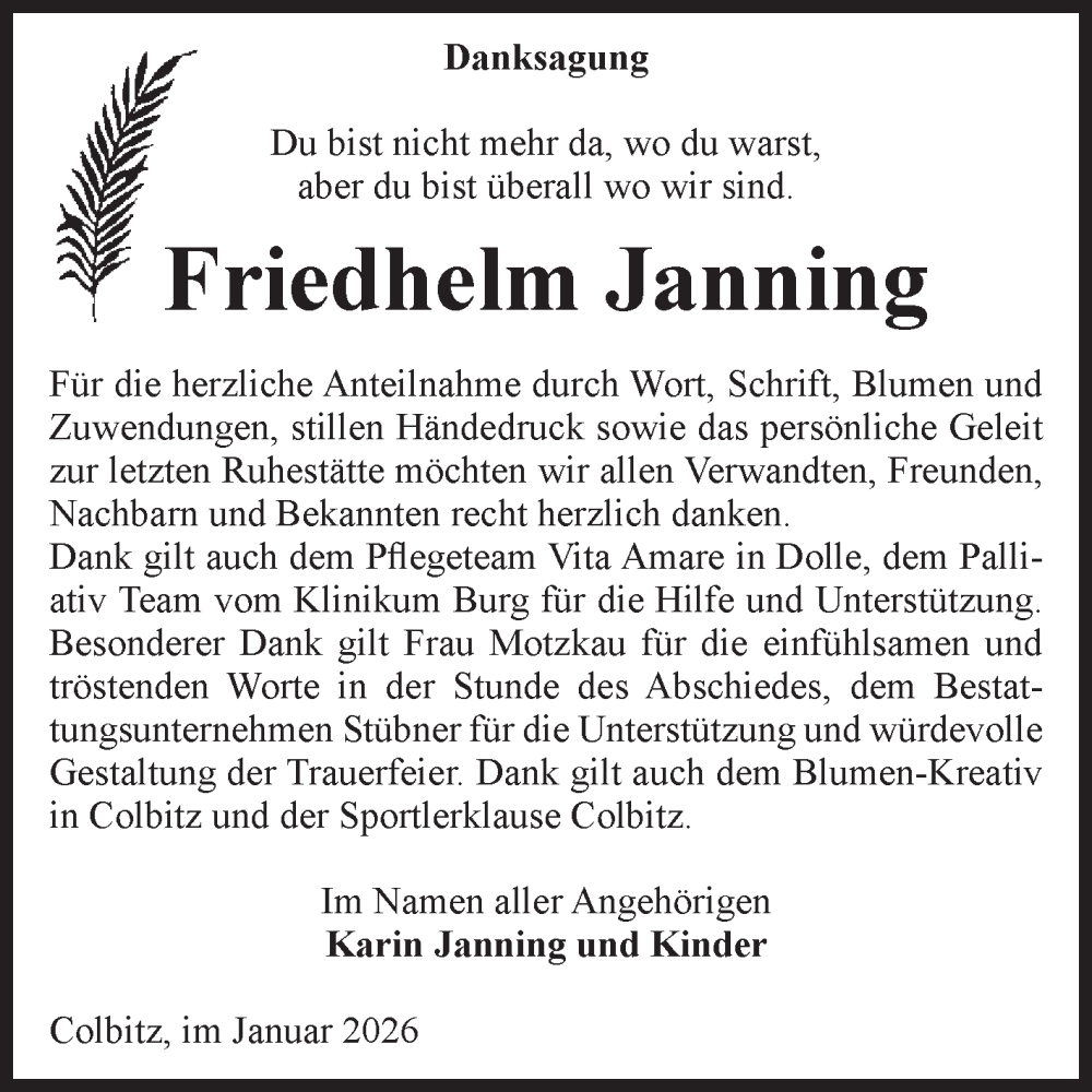 Hier finden Sie alle Traueranzeigen aus der Zeitung, die bisher für Friedhelm Janning erschienen sind. Weitere Traueranzeigen, die in der Zeitung erscheinen, werden hier ebenfalls aufgelistet