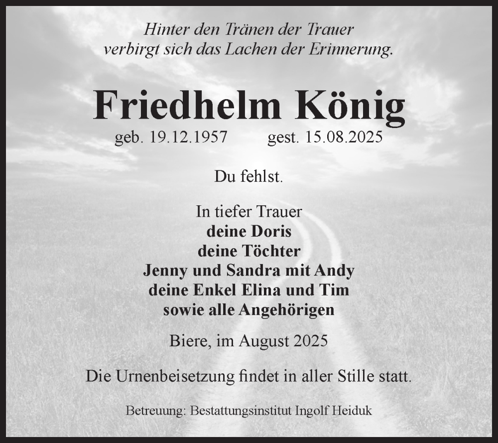 Hier finden Sie alle Traueranzeigen aus der Zeitung, die bisher für Friedhelm König erschienen sind. Weitere Traueranzeigen, die in der Zeitung erscheinen, werden hier ebenfalls aufgelistet