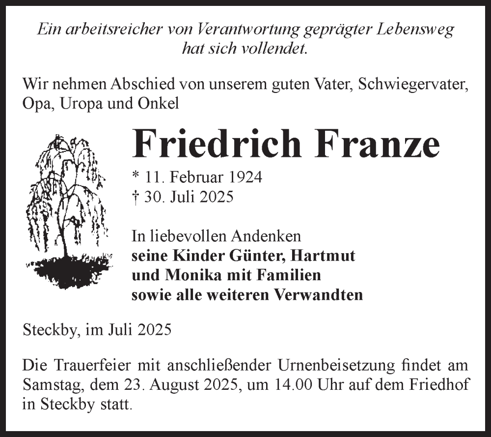 Hier finden Sie alle Traueranzeigen aus der Zeitung, die bisher für Friedrich Franze erschienen sind. Weitere Traueranzeigen, die in der Zeitung erscheinen, werden hier ebenfalls aufgelistet