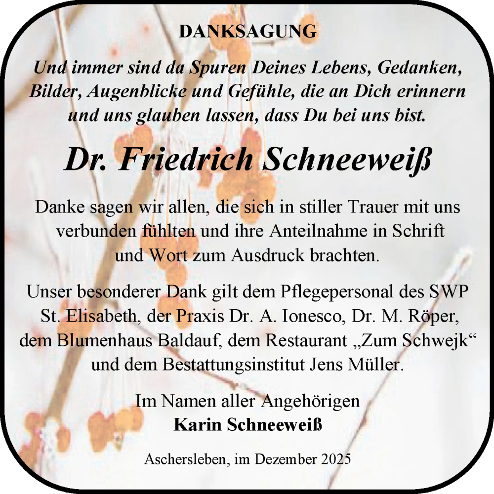 Hier finden Sie alle Traueranzeigen aus der Zeitung, die bisher für Friedrich Schneeweiß erschienen sind. Weitere Traueranzeigen, die in der Zeitung erscheinen, werden hier ebenfalls aufgelistet
