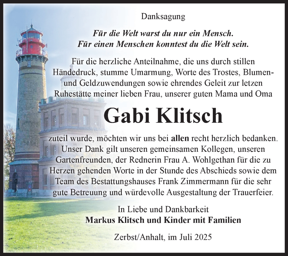 Hier finden Sie alle Traueranzeigen aus der Zeitung, die bisher für Gabi Klitsch erschienen sind. Weitere Traueranzeigen, die in der Zeitung erscheinen, werden hier ebenfalls aufgelistet