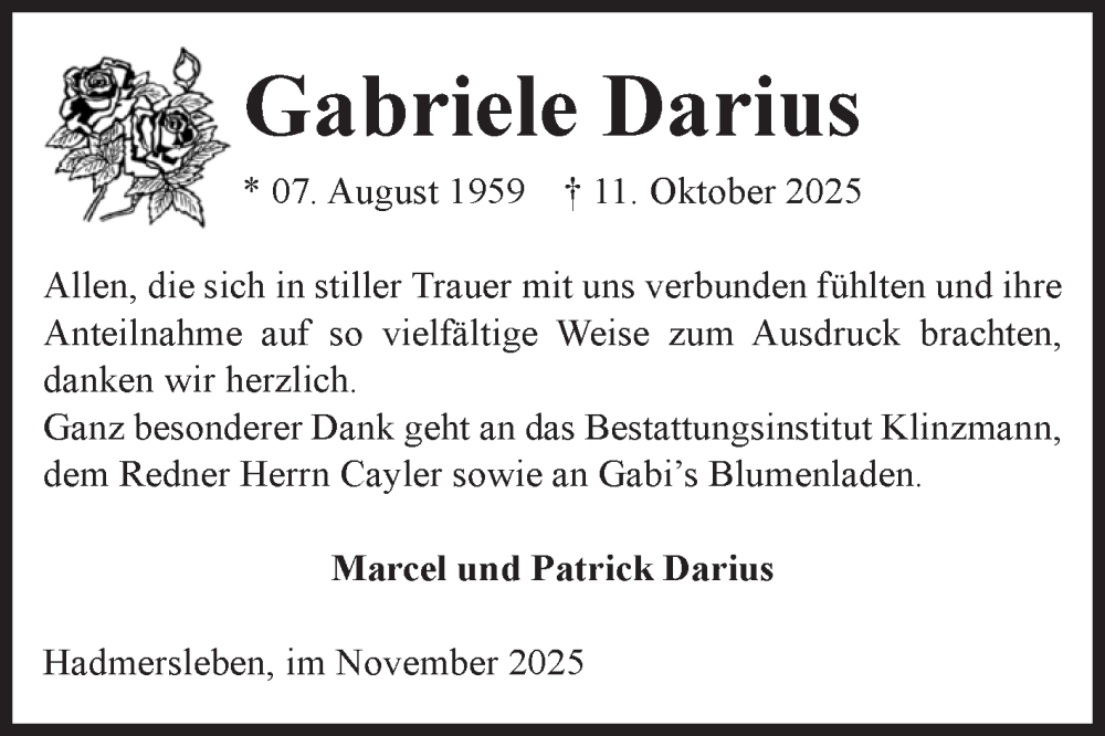 Hier finden Sie alle Traueranzeigen aus der Zeitung, die bisher für Gabriele Darius erschienen sind. Weitere Traueranzeigen, die in der Zeitung erscheinen, werden hier ebenfalls aufgelistet