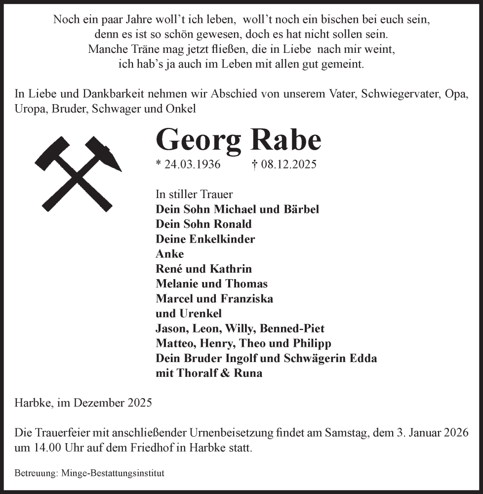 Hier finden Sie alle Traueranzeigen aus der Zeitung, die bisher für Georg Rabe erschienen sind. Weitere Traueranzeigen, die in der Zeitung erscheinen, werden hier ebenfalls aufgelistet