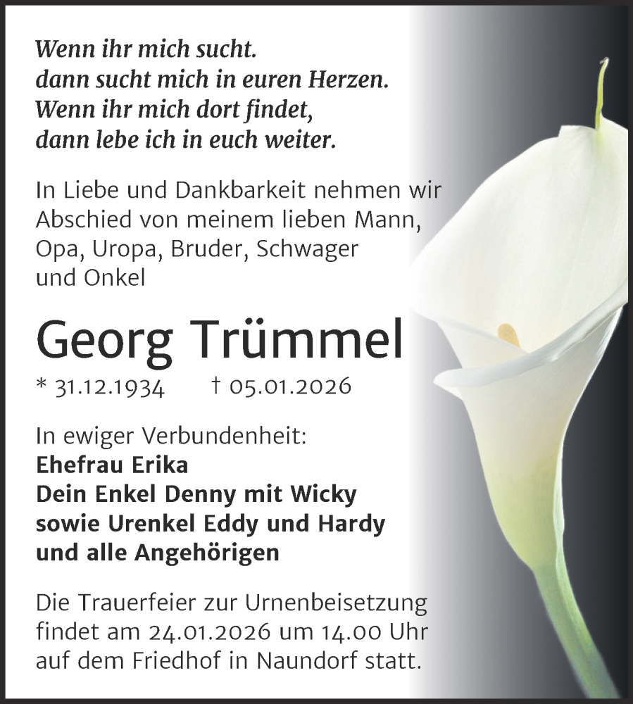 Hier finden Sie alle Traueranzeigen aus der Zeitung, die bisher für Georg Trümmel erschienen sind. Weitere Traueranzeigen, die in der Zeitung erscheinen, werden hier ebenfalls aufgelistet