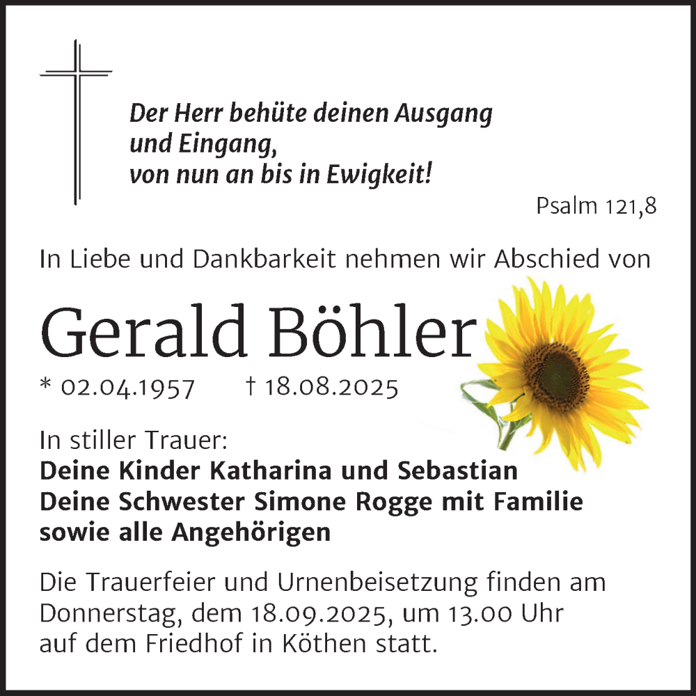 Hier finden Sie alle Traueranzeigen aus der Zeitung, die bisher für Gerald Böhler erschienen sind. Weitere Traueranzeigen, die in der Zeitung erscheinen, werden hier ebenfalls aufgelistet