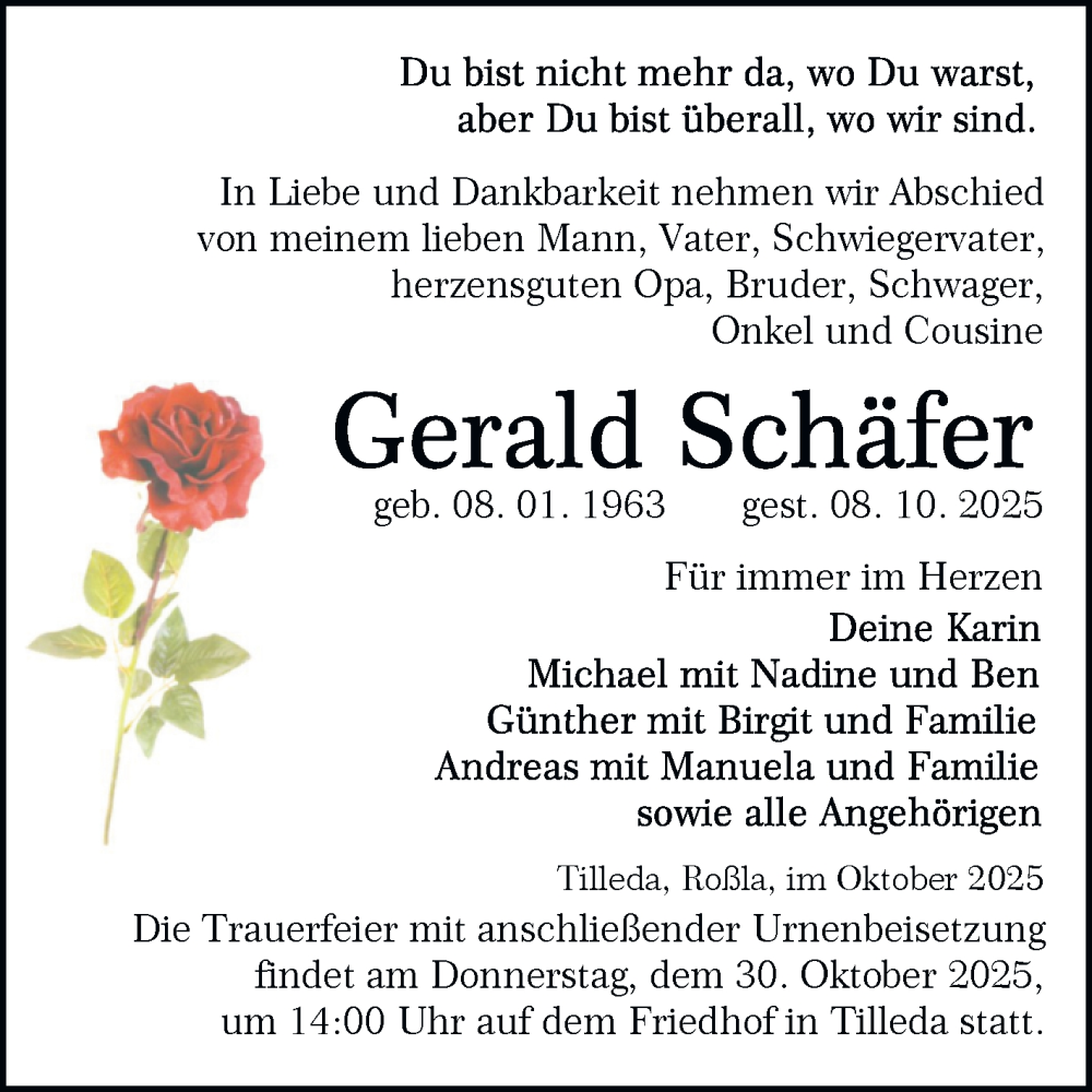Hier finden Sie alle Traueranzeigen aus der Zeitung, die bisher für Gerald Schäfer erschienen sind. Weitere Traueranzeigen, die in der Zeitung erscheinen, werden hier ebenfalls aufgelistet