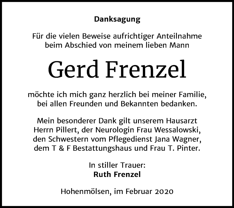 Hier finden Sie alle Traueranzeigen aus der Zeitung, die bisher für Gerd Frenzel erschienen sind. Weitere Traueranzeigen, die in der Zeitung erscheinen, werden hier ebenfalls aufgelistet