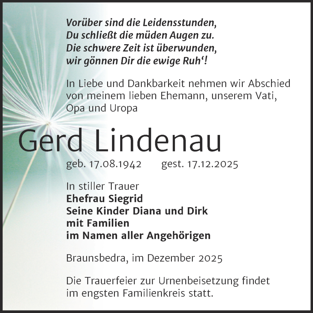 Hier finden Sie alle Traueranzeigen aus der Zeitung, die bisher für Gerd Lindenau erschienen sind. Weitere Traueranzeigen, die in der Zeitung erscheinen, werden hier ebenfalls aufgelistet