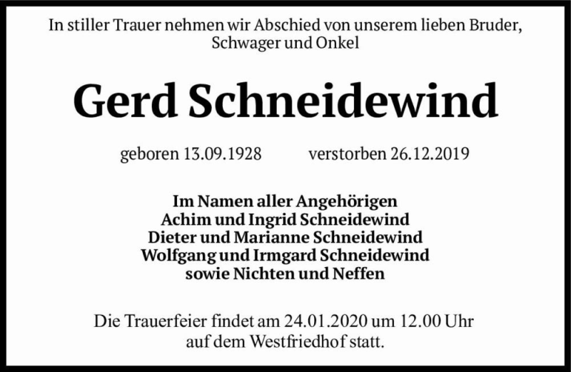 Hier finden Sie alle Traueranzeigen aus der Zeitung, die bisher für Gerd Schneidewind erschienen sind. Weitere Traueranzeigen, die in der Zeitung erscheinen, werden hier ebenfalls aufgelistet