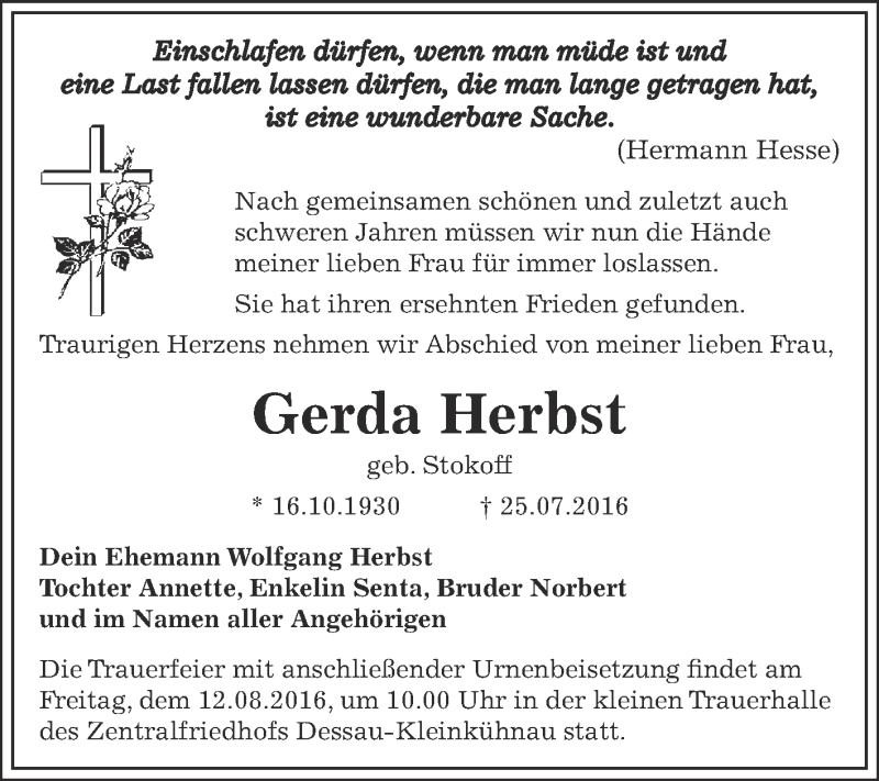 Hier finden Sie alle Traueranzeigen aus der Zeitung, die bisher für Gerda Herbst erschienen sind. Weitere Traueranzeigen, die in der Zeitung erscheinen, werden hier ebenfalls aufgelistet
